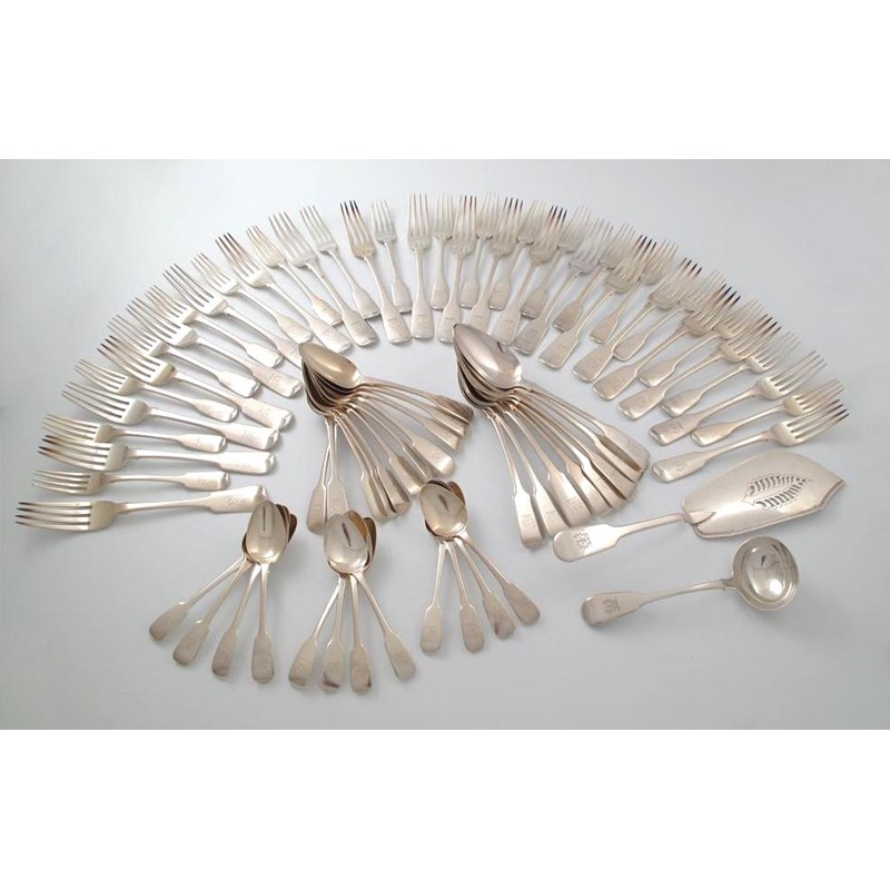 the terminals engraved with a crest, comprising: a fish slice, twenty table forks, eight tablespoons, twelve dessert spoons, twenty dessert forks, twelve teaspoons and a sauce ladle, approx. weight 120oz. (74)