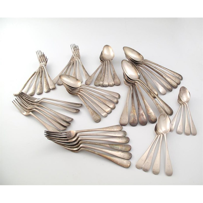 the terminals engraved with a crest, comprising: twelve table spoons, twenty four dessert forks, twelve dessert spoons, eight teaspoons, approx. weight 90 oz.
