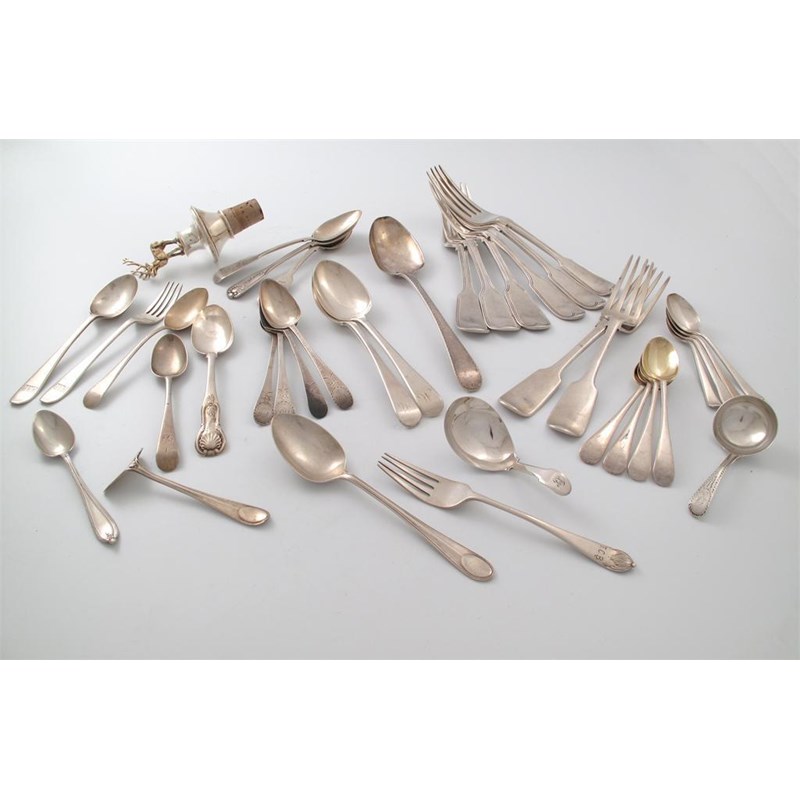 comprising: a set of six Fiddle and Thread pattern table forks, London 1857 and 1863, a pair of table forks, a George III Bright-cut caddy spoon, London 1800, by Mary Chawner, a Fiddle pattern caddy spoon, London 1811, a tablespoon, a pair of dessert spoons, seventeen teaspoons and two forks, a pusher, a modern bottle stopper, modelled as a standing stag, and four electroplated spoons, approx. weight 36oz.