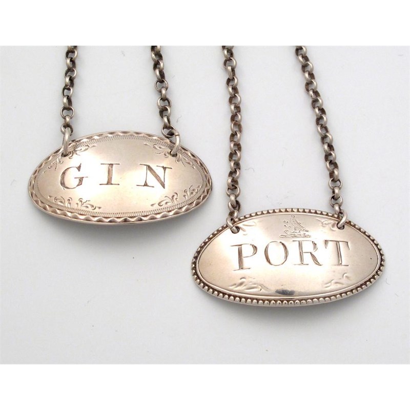 oval eye form, beaded border, engraved with a crest and incised 'PORT', length 4.4cm, plus a George III silver wine label, by James Hyde, circa 1790, eye form, bright-cut border, incised 'GIN', length 4.2cm. (2)