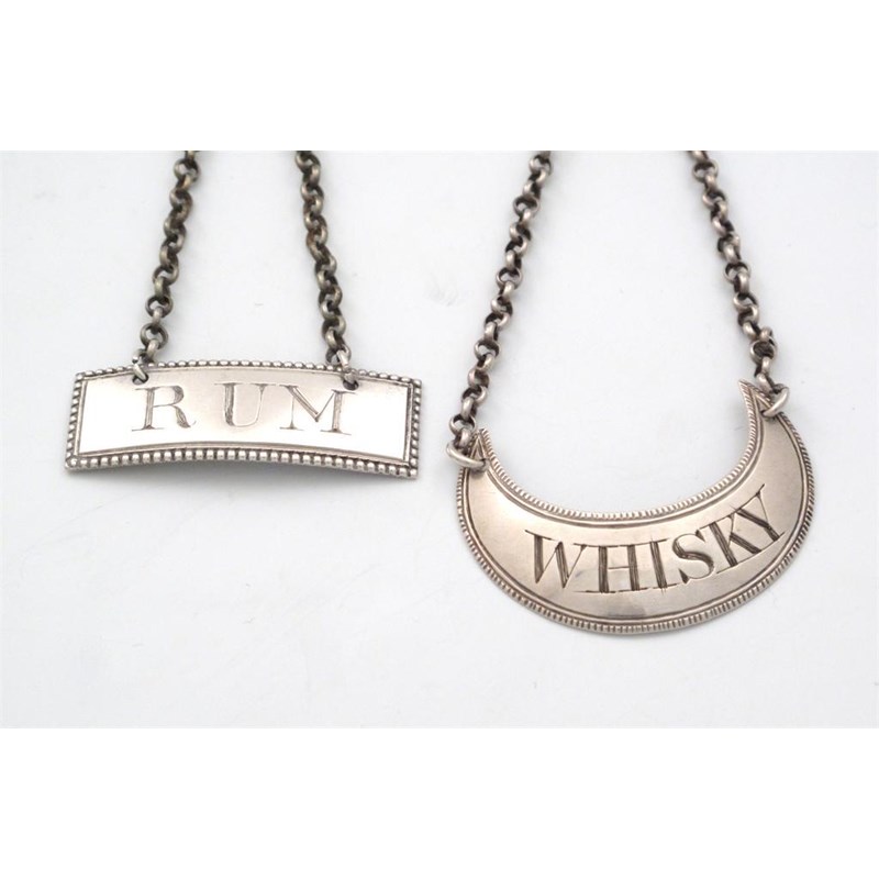 crescent form, beaded borders, incised 'WHISKY', length 4.1cm, plus a George III silver wine label, with maker's mark only, S.B, for Susannah Barker, circa 1790, rectangular form, beaded border, incised 'RUM', length 4.1cm. (2)