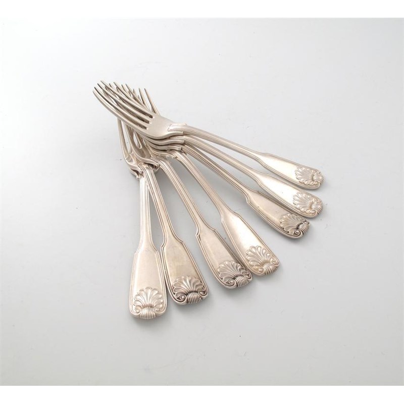 A set of six George III Fiddle, Thread and Shell pattern table forks,