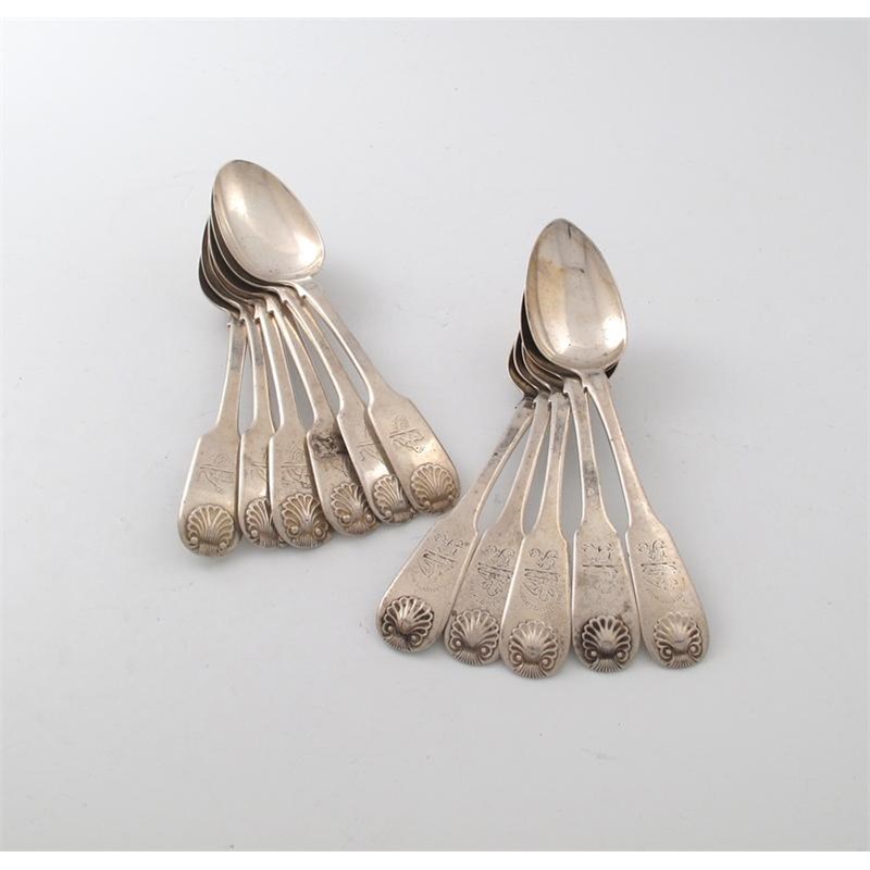 A matched set of eleven silver Fiddle and Shell pattern dessert spoons,
