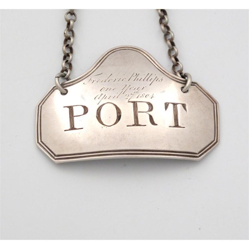 rectangular form with a raised pediment, reeded border, incised 'PORT', and engraved 'Frederick Phillips, one year, april 27 1804', length 4.7cm.