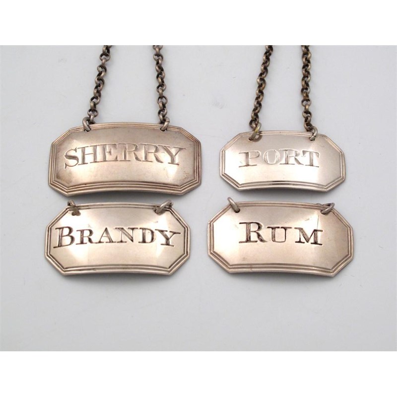 rectangular form, canted corners, reeded borders, all incised, comprising, a pair of labels, 'RUM' and 'BRANDY' by Phipps and Robinson, London 1797, length 4.1cm, 'SHERRY' by Susannah Barker, London 1792, length 4.5cm, and 'BRANDY', by Phipps and Robinson, London 1797, and 'PORT', by Mary Hyde and John Reily, London 1800, length 3.7cm. (4)