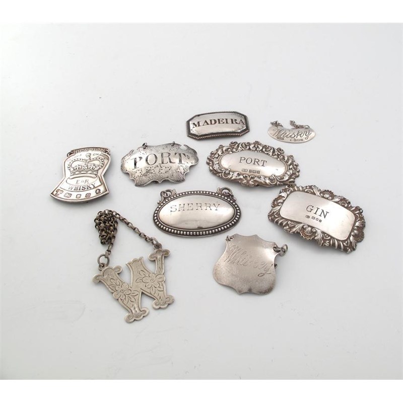 comprising: one of cartouche form, by Sandylands Drinkwater, incised 'PORT', plus a Queen's Silver Jubilee label, 'WHISKY', and four other silver examples, plus three electroplated examples. (8)