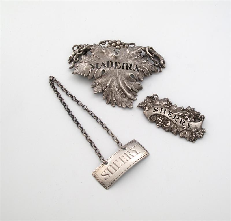 pieced 'MADEIRA', plus a George Unite label, pierced 'SHERRY', and a George III silver wine label, with maker's mark of T.H, incised 'SHERRY'. (3)