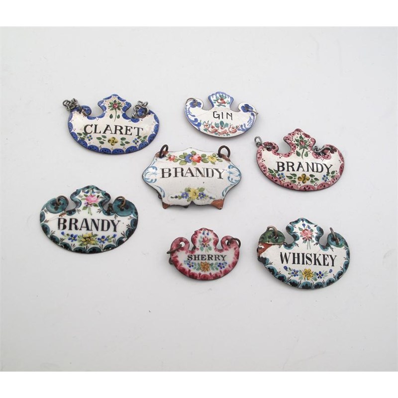comprising one of escutcheon form, titled 'BRANDY', plus two further 'BRANDY' labels, and four others: 'WHISKEY' 'GIN', 'SHERRY' and 'CLARET'. (7)