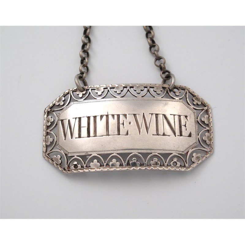 rectangular form, canted corners, with a pierced foliate border and bright-cut decoration, incised 'WHITE WINE', length 4.7cm.