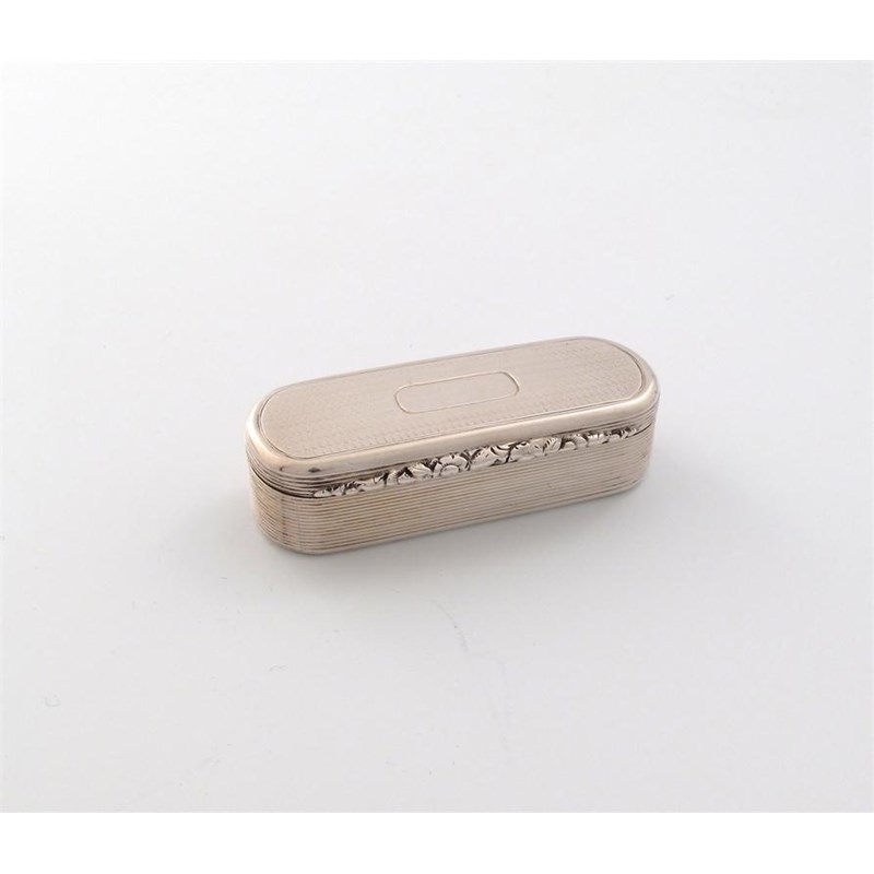 rounded rectangular form, reeded sides and engine turned cover and base, scroll thumb-piece, length 8.4cm, approx. weight 2oz.