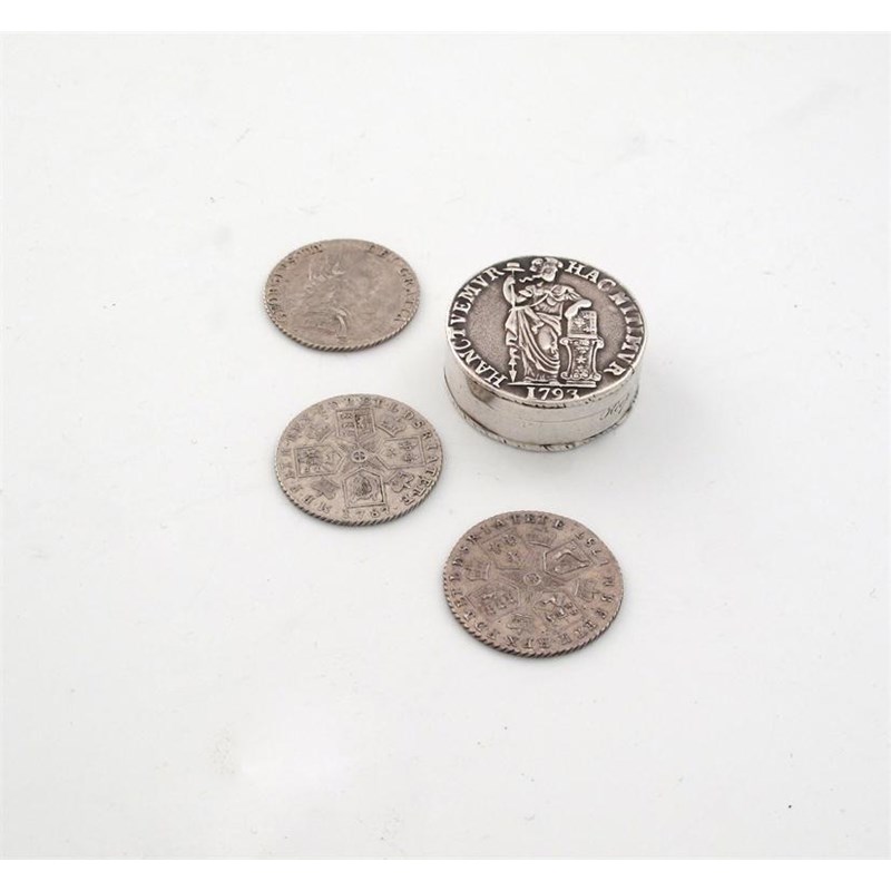 circular form, the base and cover made from a coin, the side inscribed, 'Keep your temper', the interior with three counters, diameter 3cm.
