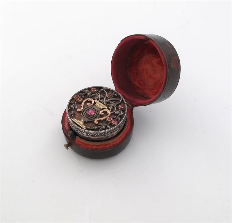 circular form, with engraved borders, the cover with cage-work depicting a two coloured gold urn with sprays of silver flowers set with rose cut diamonds and rubies, in a fitted velvet lined case, diameter 3.5cm.