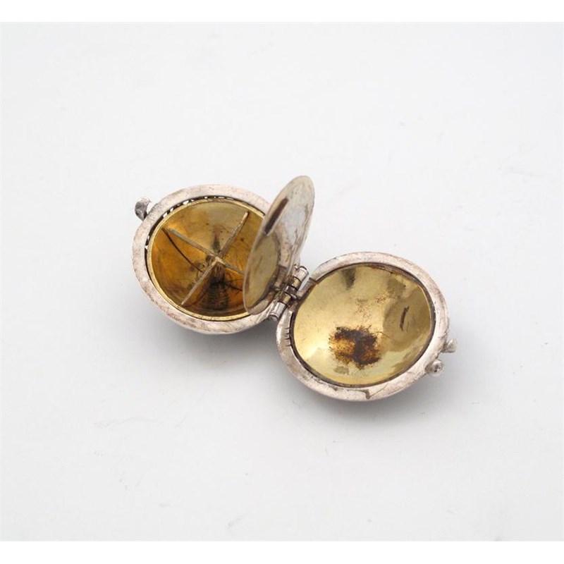circular form, filigree decoration, with a ring attachment, the pomander opens to reveal four compartments with a cover, diameter 2.1cm