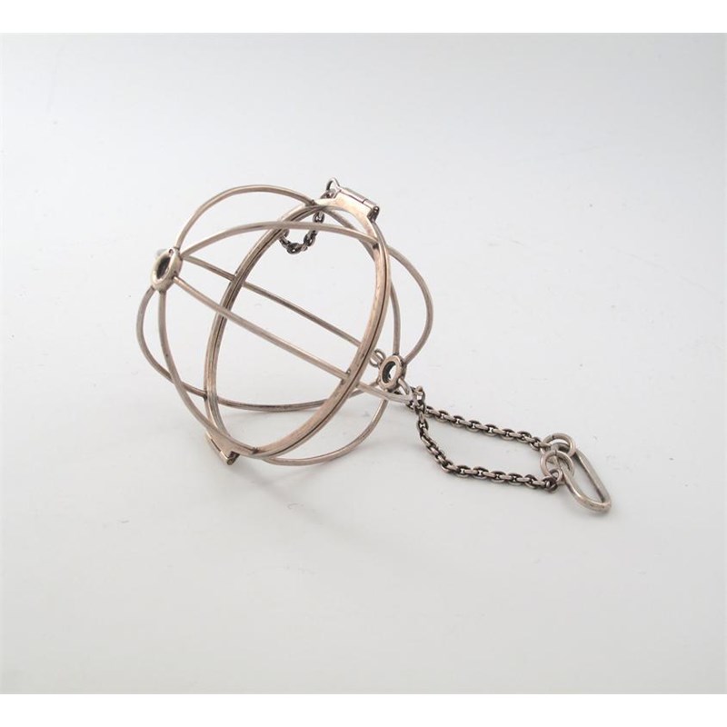 globe form, with a hinged cover and hanging chain, diameter 9.5cm, approx. weight 3oz.