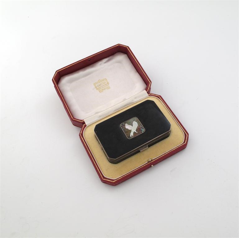 rectangular form, the base, sides and top with black enamel and set with a central plaque of two mother-of-pearl doves, the interior with a mirror, and two hinged compartments, lipstick holder missing, in a fitted case, length 8.5cm.