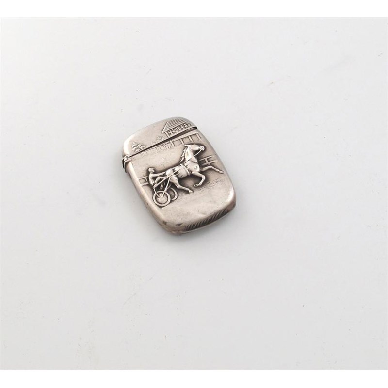 rounded rectangular form, embossed with a scene of a trotting race, the reverse with a monogram, height 6.2cm.