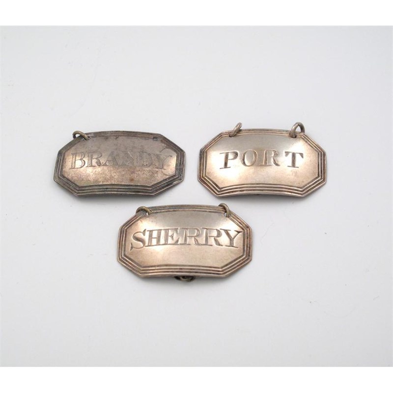 rectangular form, canted corners, reeded borders, incised 'PORT', 'SHERRY' and one re-titled 'BRANDY'. (3)