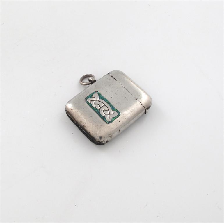 rectangular form, the front with an inter-twined Celtic motif with blue green enamel decoration, length 4.8cm.