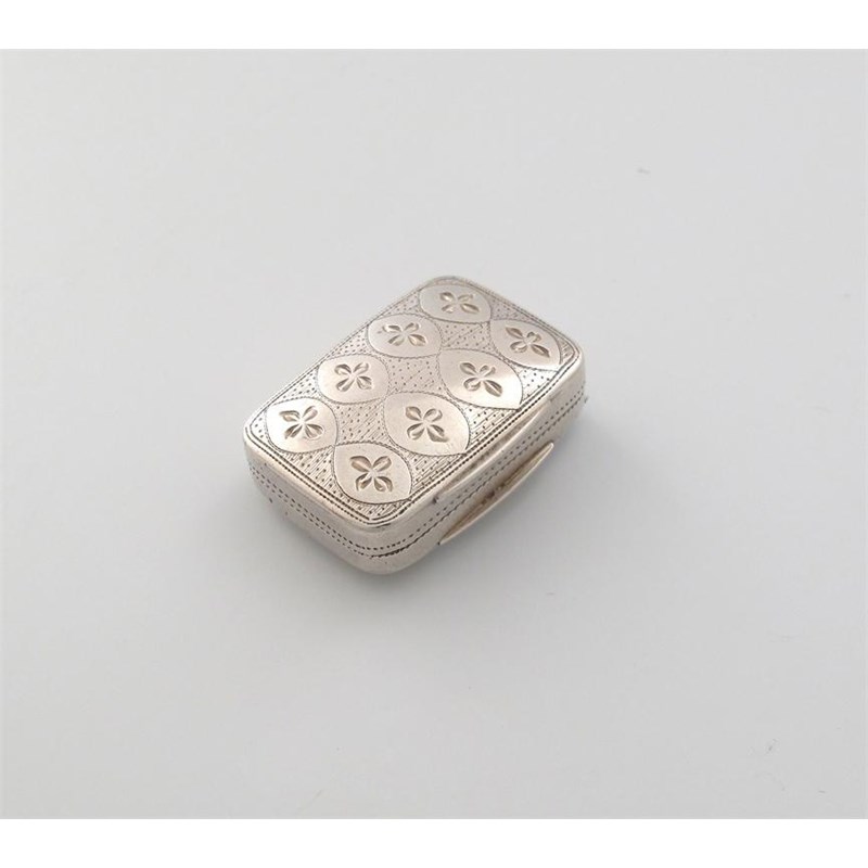 rectangular form, with engraved decoration on a matted background pierced grille, length 3cm, approx. weight 0.3oz.