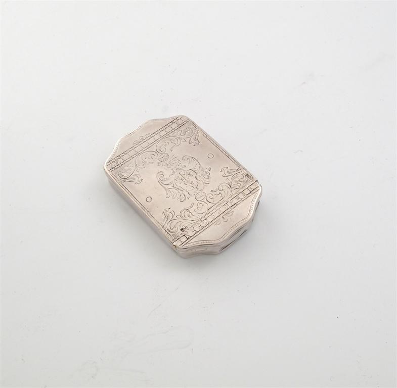 shaped rectangular form, he flush hinged cover engraved with and armorial within foliate scroll mantling, the base scratch initialled 'D*G', length 7.3cm, approx. weight 1.5oz