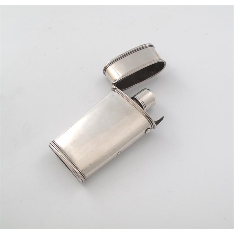 tapering oval form, hinged cover, reeded borders, the interior with a glass scent bottle, height 8.8cm.