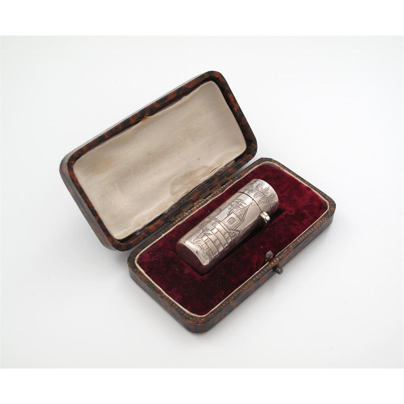 cylindrical form, engraved with children in the Kate Greenaway manner, in a later fitted case, length 5cm.