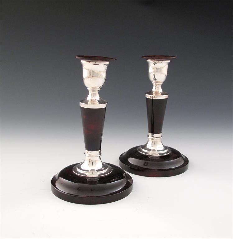 tapering circular form, plain mounts and urn capitals, removable drip pans, on raised circular bases, height 13.8cm. (2)