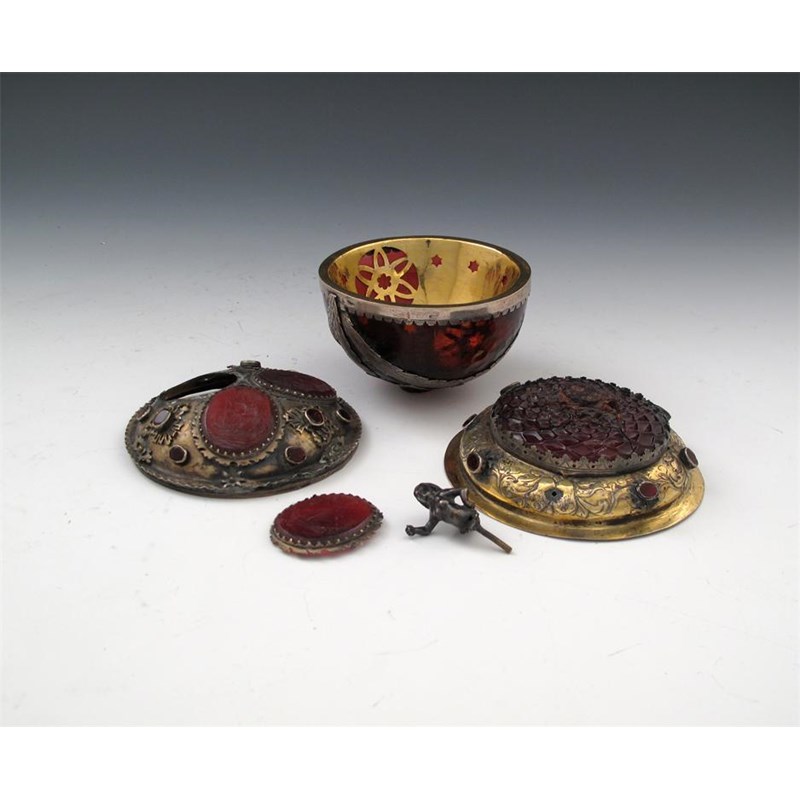 comprising a mermaid finial, a cover set with three glass cameos of galleons, a circular bowl engraved with galleons, and with foliate straps, and a raised circular base applied with cabochons, damage. (4)