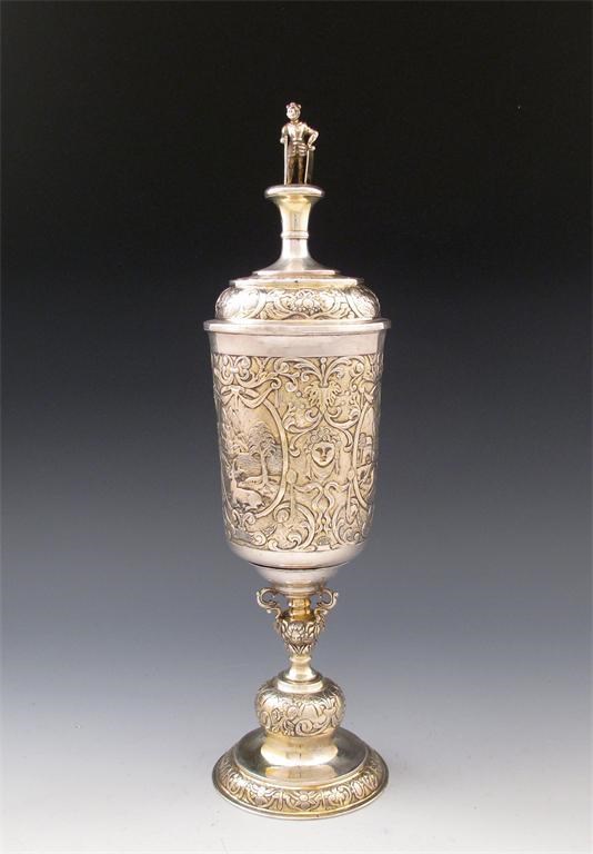 in the 17th century manner, with chased foliate, mask and scroll decoration, with three panels of landscape scenes, the pull-off cover with a figural finial, on a raised circular foot, height 38.5cm, approx. weight 20oz.