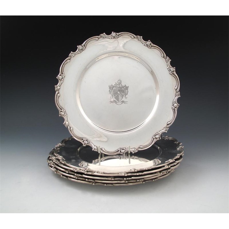 shaped circular form, foliate scroll border, the centre engraved with an armorial, diameter 26cm, approx. weight 100oz. (6)