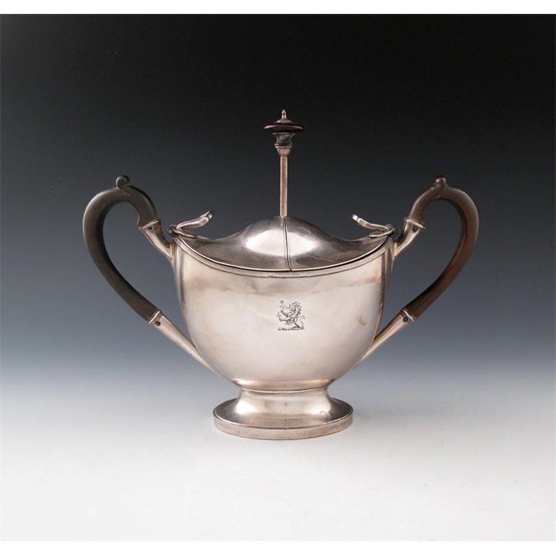 oval form, scroll side handles, the double hinged domed cover opens to reveal a pull-out wirework four egg frame, on a raised oval foot, length handle to handle 16.8cm.