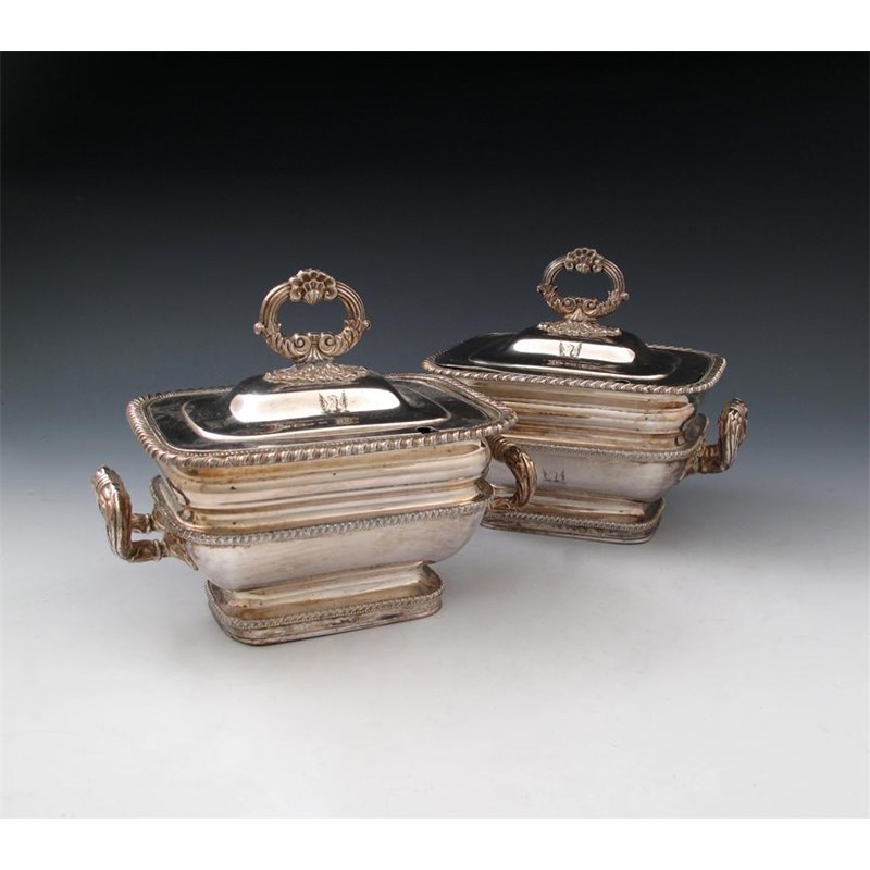 rounded rectangular form, gadroon borders, engraved with a crest, the pull off covers with foliate scroll handles, length 18.5cm. (2)