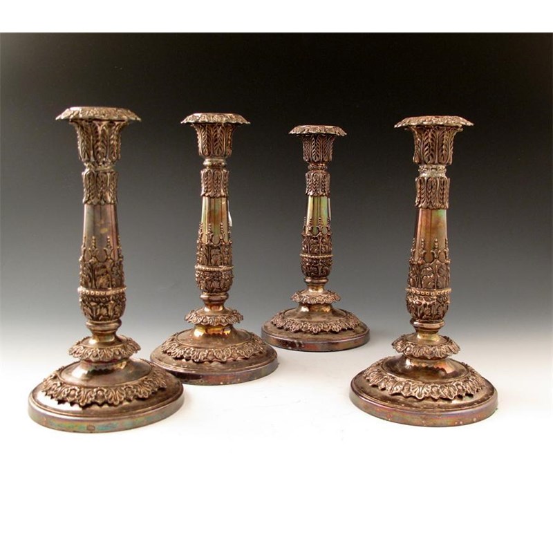 tapering circular form, acanthus leaf decoration, on raised circular bases, repairs, height 21.8cm. (4)