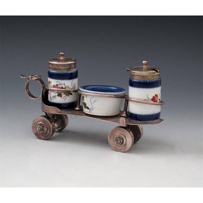 on four wheels with a strap ring handle, with a ceramic mustard pot, salt cellar and pepper pot, with floral design, length 19.5cm.