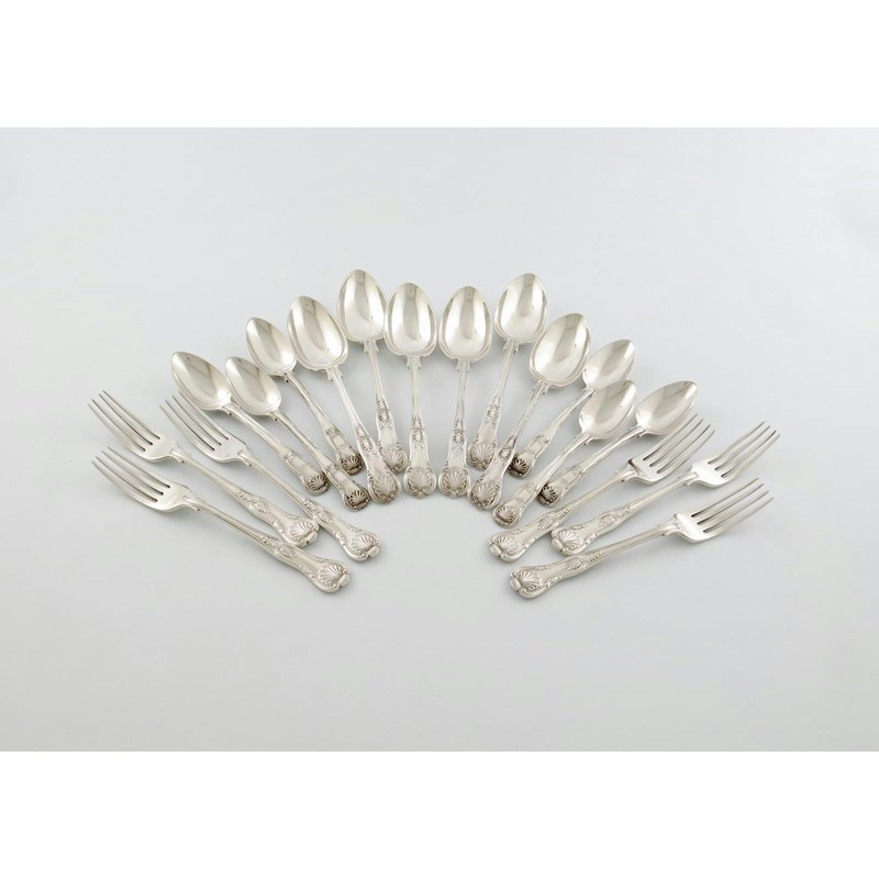 comprising: a set of six William IV King's Hourglass pattern teaspoons, by Messrs. Lias, London 1833 and 1834, the terminals initialled, and a matched set of six modern dessert spoons and six dessert forks, by C. J. Vander and Joseph Rodgers, approx. weight 31oz. (18)