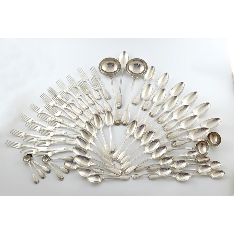 A matched George III / IV silver Fiddle, Thread and Shell pattern canteen for twelve,