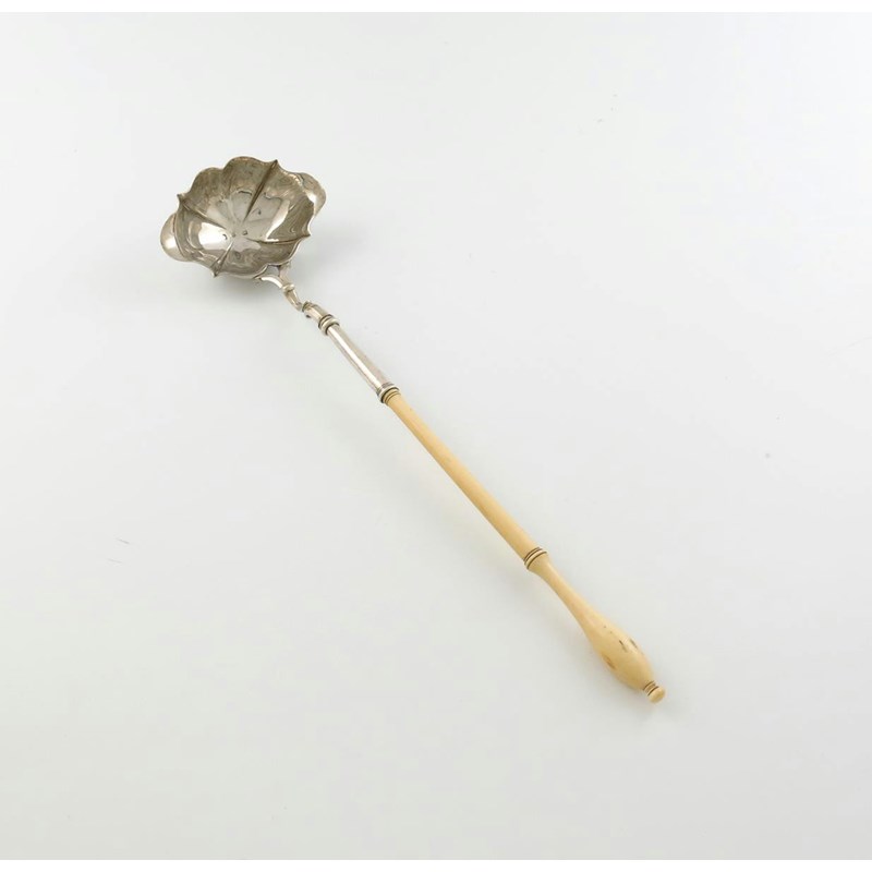 λ A George II silver punch ladle,maker's mark worn, London 1742, shaped oval bowl, pierced supports, turned baluster ivory handle, length 35cm, approx. weight 3.4oz.