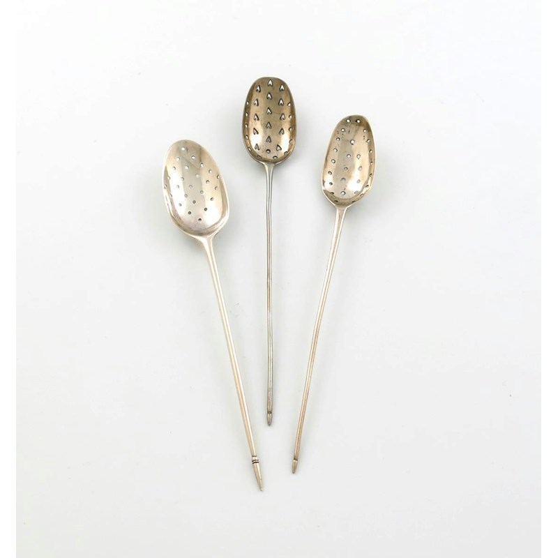 comprising: an early 18th century one with maker's mark partially lost, ?R, the bowl with plain piercing, one with pierced heart decoration, and one with worn marks, length of longest 15cm, approx. total weight 0.7oz. (3)