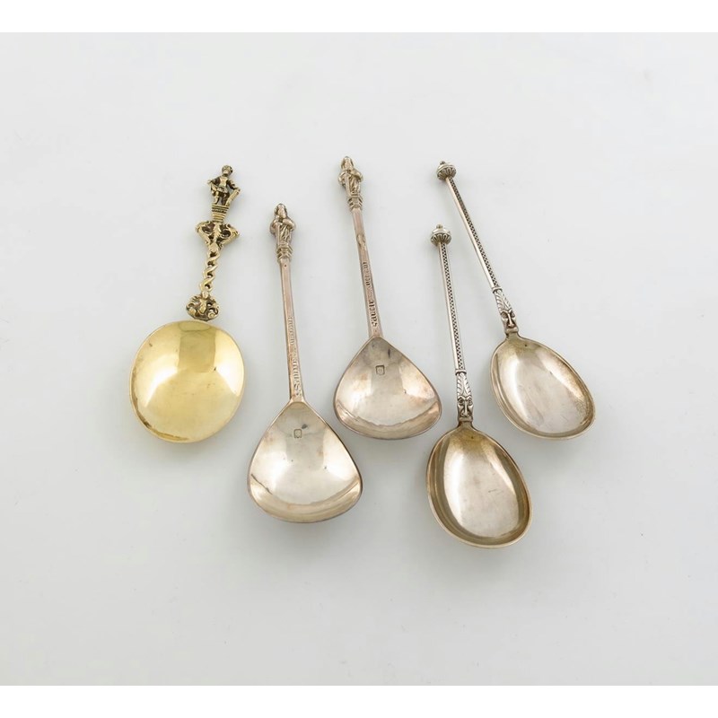 comprising: a pair of Apostle spoons, by Hicklenton and Phillips, London 1936, a pair of spoons with import marks for London 1882, importer's mark of Alexander Crichton, and a silver-gilt spoon in the Dutch manner, London 1909, approx. weight 11oz. (5)