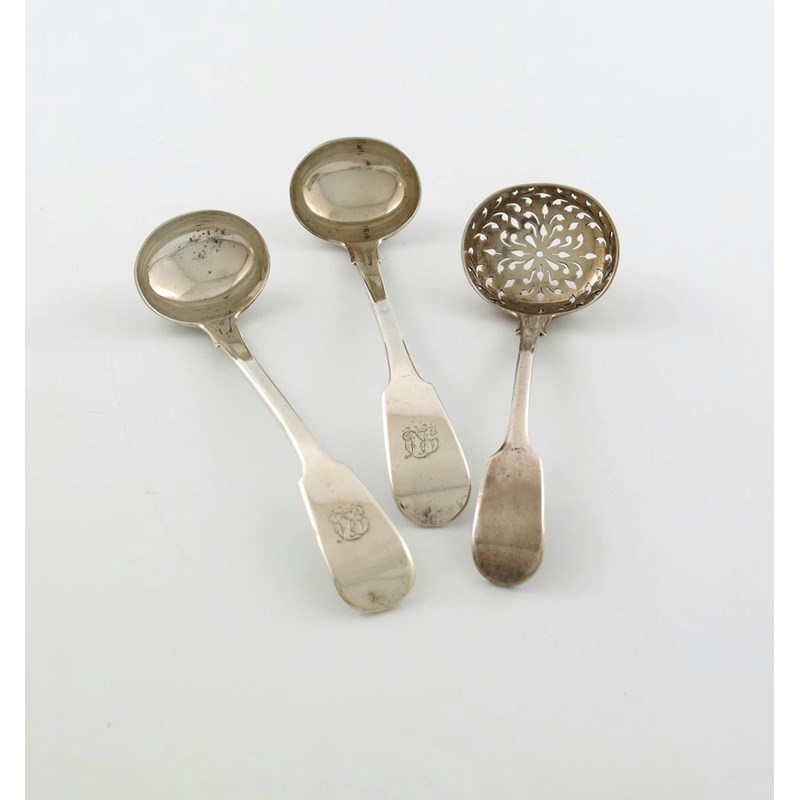 the terminals with a monogram, plus a Victorian provincial silver Fiddle pattern sugar sifting spoon, by Messrs. Williams, Exeter 1845, approx. total weight 4oz. (3)