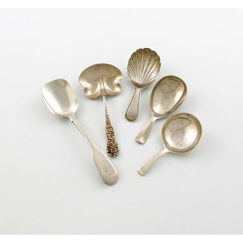 comprising: one with a fluted bowl, London 1811, an American caddy spoon with a foliate handle, plus three others, approx. weight 2.5oz. (5)