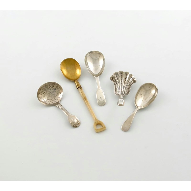 λ A small collection of five silver caddy spoons, comprising: one with a fluted bowl, by Hilliard and Thomason, Birmingham 1867, one London 1818, plus two others and an unmarked silver-gilt spoon, with an ivory spade handle, approx. weight 2.3oz. (5)
