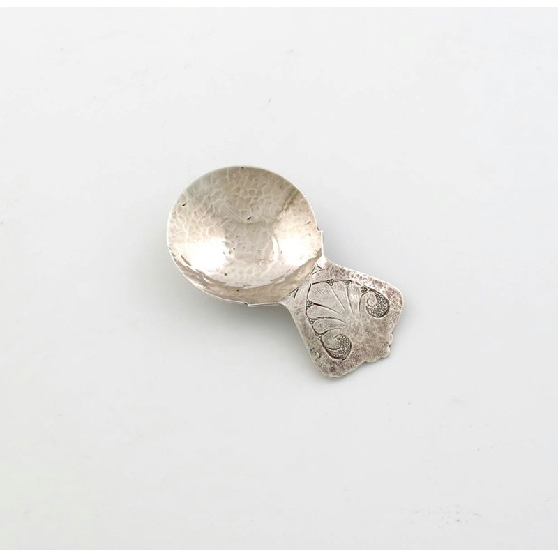 circular spot-hammered bowl, the spread handle with a foliate motif, length 8.2cm, approx. weight 0.9oz.