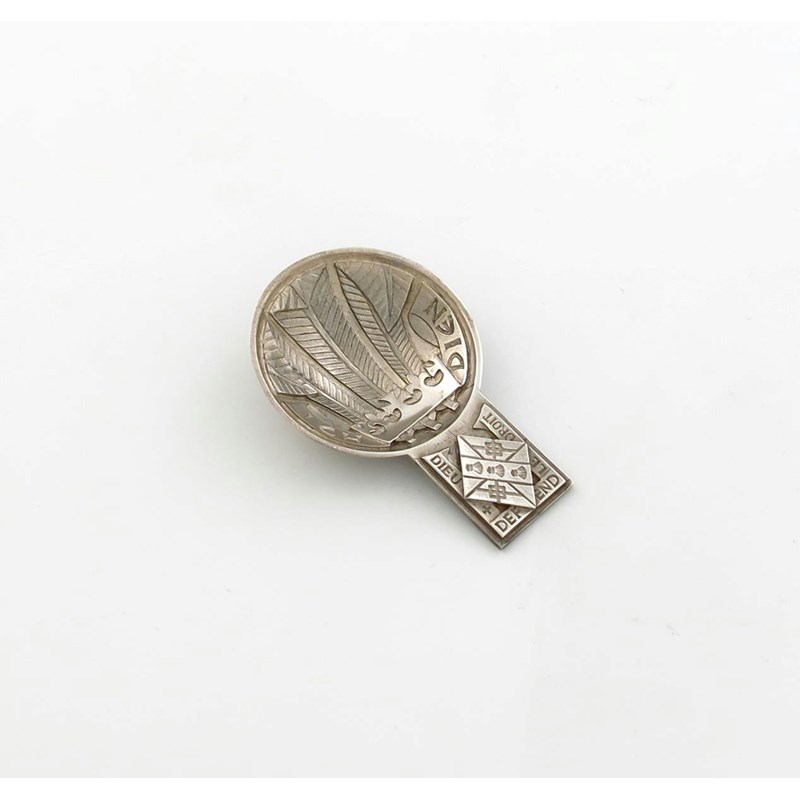 celebrating the marriage of Prince Charles to Lady Diana Spencer, circular bowl with Prince of Wales feathers, the rectangular handle with an armorial, the reverse of the bowl engraved B.E.A, length 6.8cm, approx. weight 1oz.