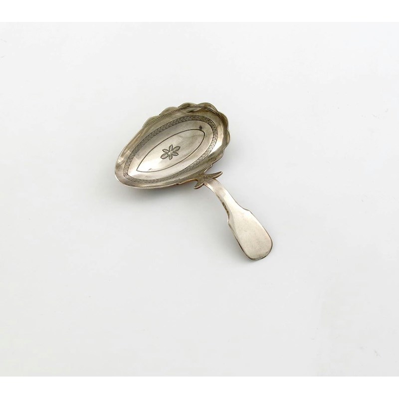 the handle with a fish-tail motif, oval bowl, engraved decoration, length 8.5cm, approx. weight 0.5oz.