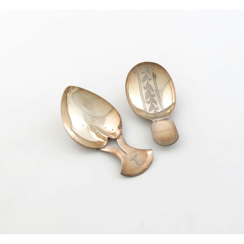 heart-shaped bowl, bifurcated handle, engraved with a crest, length 7.3cm, plus a George III silver caddy spoon, by Josiah Snatt, London 1807, oval bowl, engraved decoration, length 6.4cm, approx. total weight 0.5oz. (2)