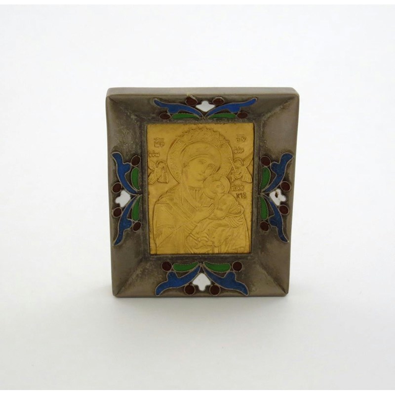 rectangular form, depicting the Madonna and Child, in a base metal frame with enamel decoration, length 7.2cm.