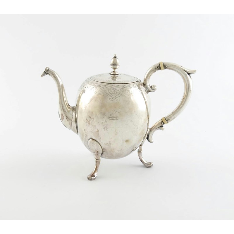 λ A late 19th century continental silver teapot, marked 800M, probably Scandinavian, ovoid form, scroll handle, domed hinged cover with an acorn finial, engraved decoration, on three scroll feet, with a worn crest, height 17cm, approx. weight 15oz.