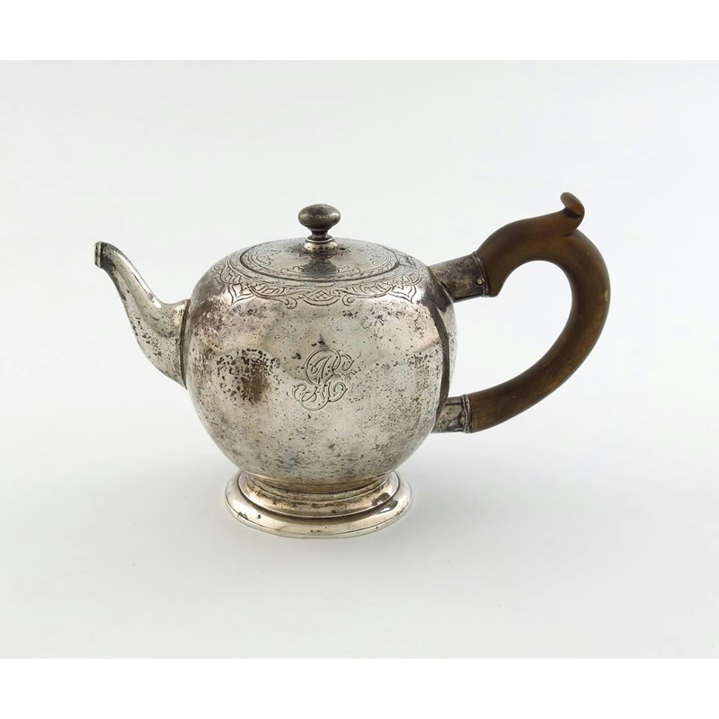 bullet form, scroll handle, engraved foliate scroll decoration, the hinged cover with a ball finial, engraved with initials, on a circular foot, length handle to spout 18.5cm, approx. weight 12.5oz.