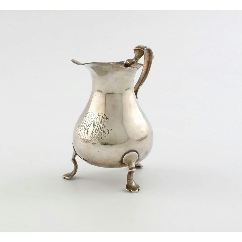baluster form, wavy-edge border, leaf capped scroll handle, on three hoof feet, engraved with a monogram, height 10cm, approx. weight 3oz.
